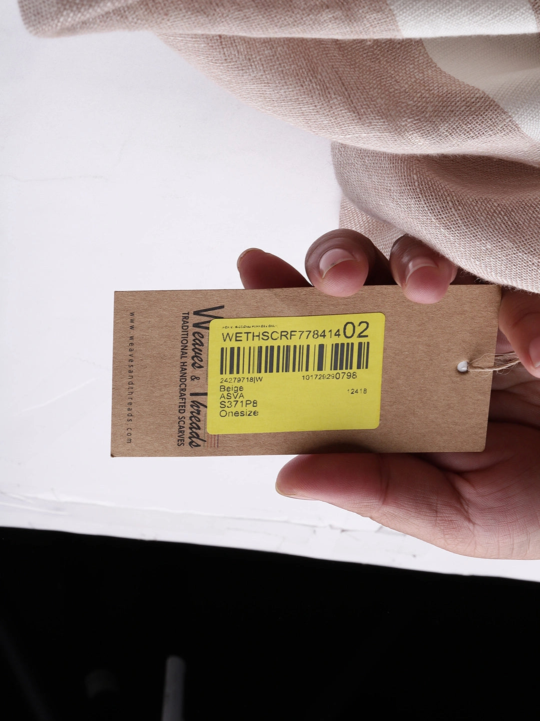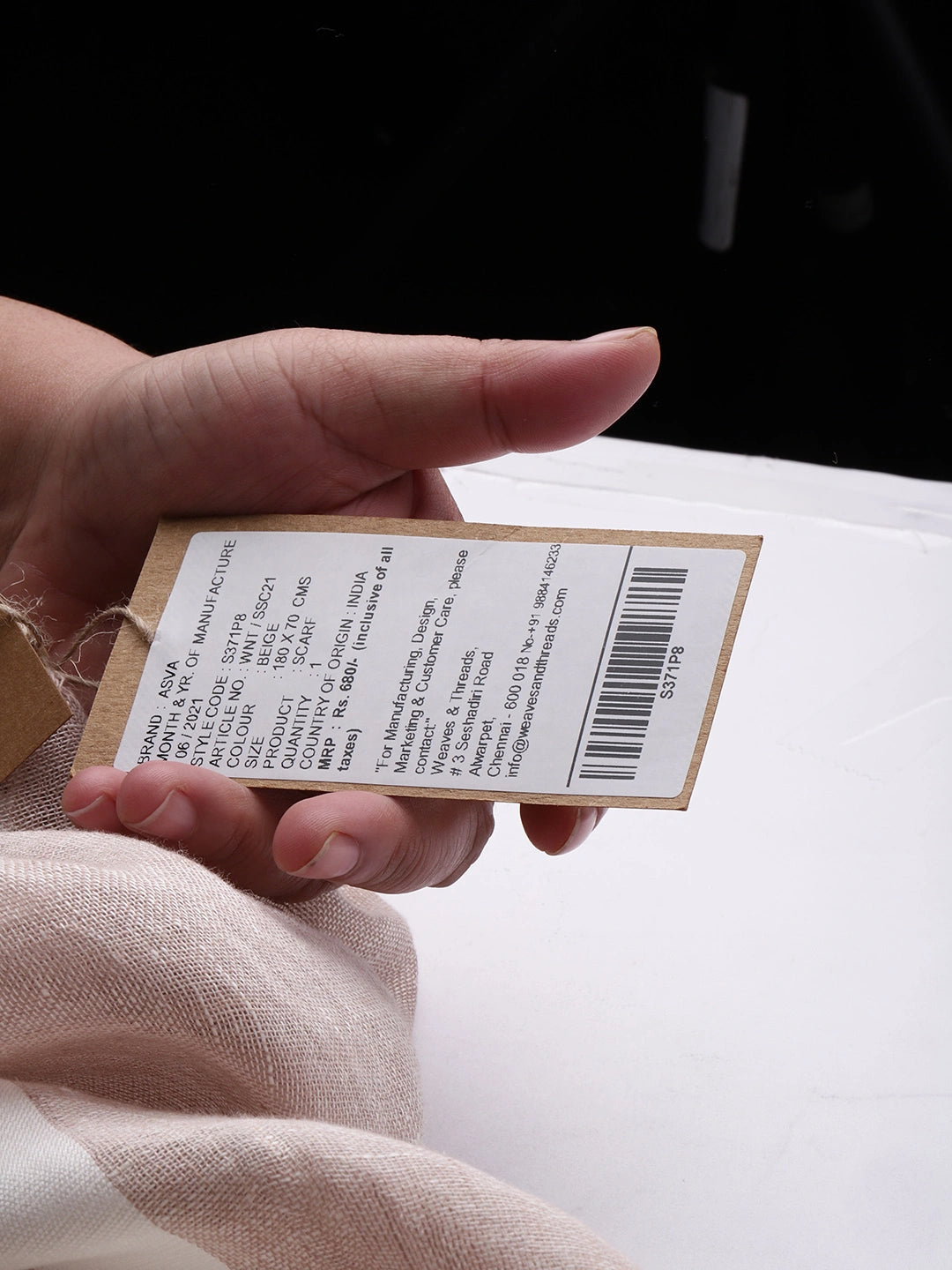 ASVA Cotton Linen Scarf: Beige with White Stripes and Blue Selvedge