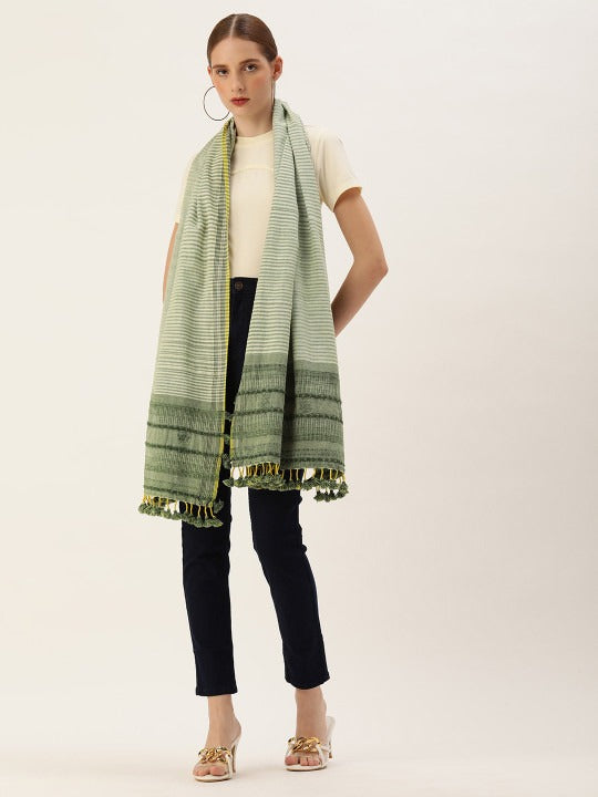 ASVA Handcrafted Cotton Scarf in White & Green with Tassels
