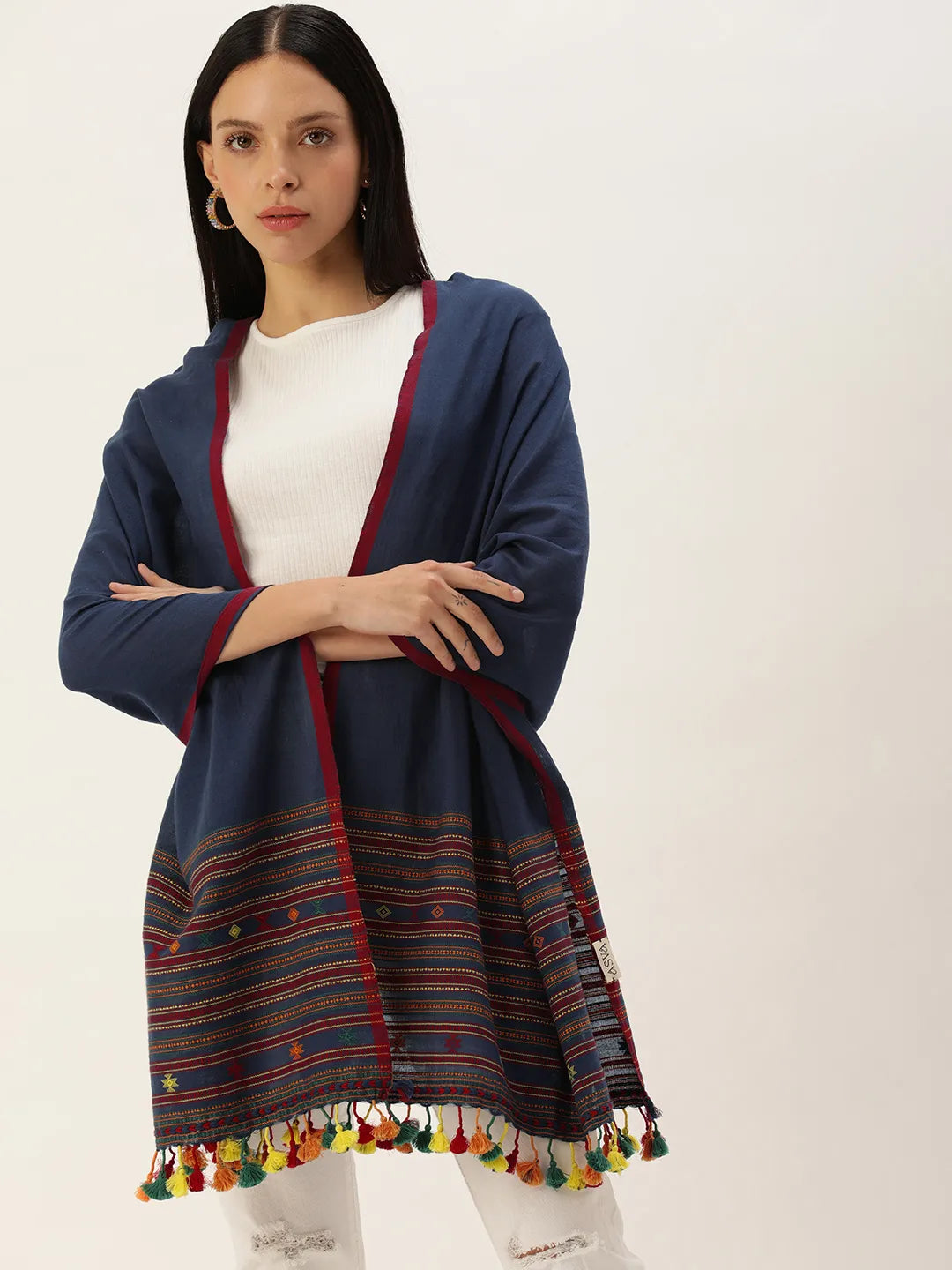 Asva Handwoven Cotton Scarf: Blue with Red Selvedge Multi Colour Stripes & Colorful Tassels