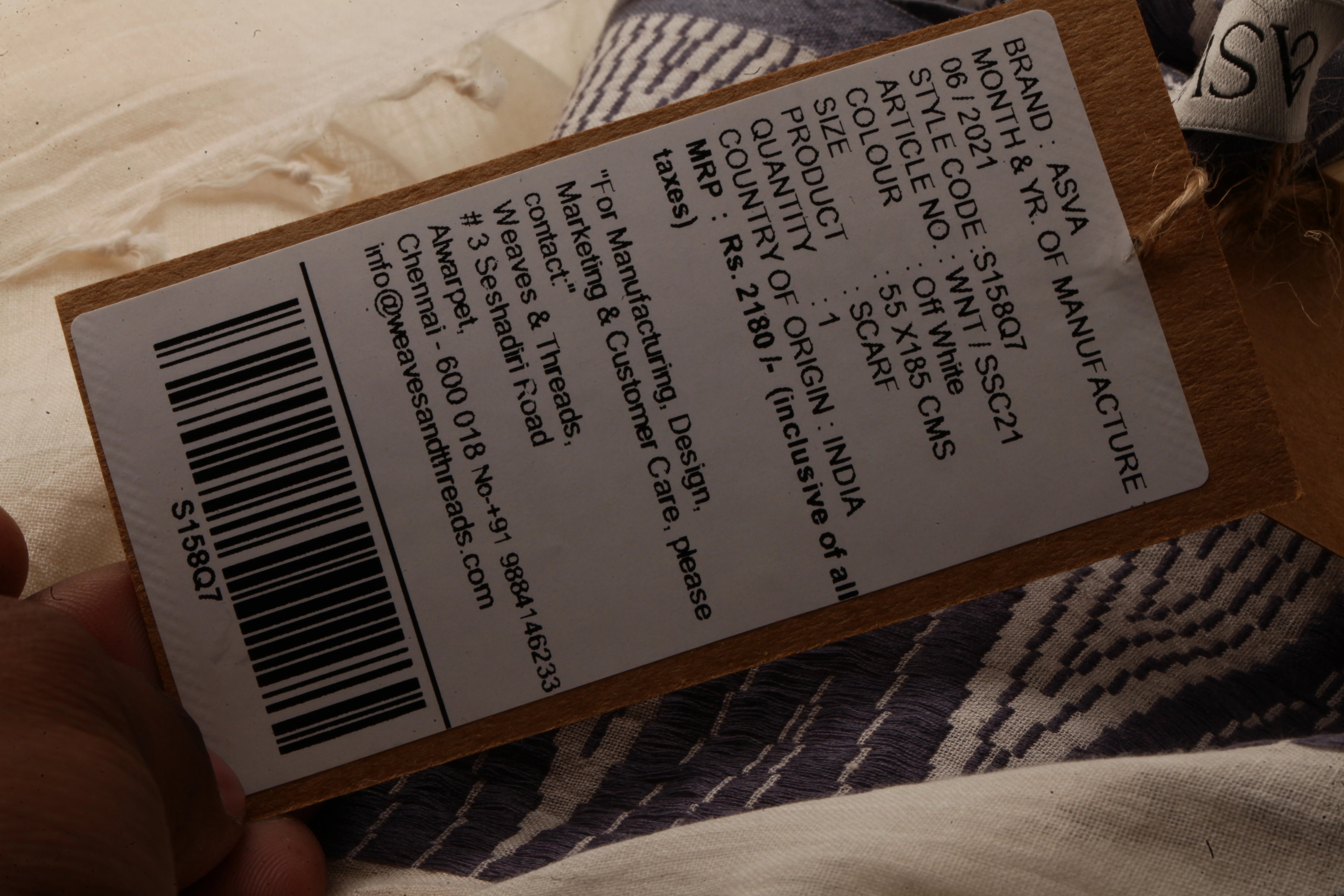 ASVA Women's Off-White Cotton Scarf with Blue Handwoven Border Design on One Side