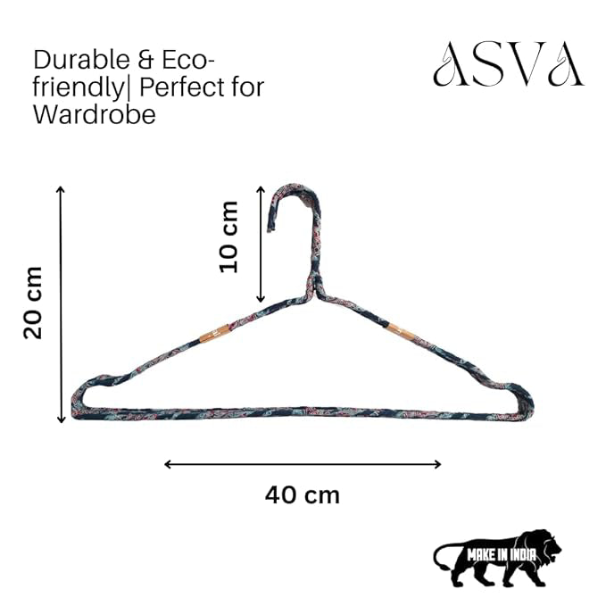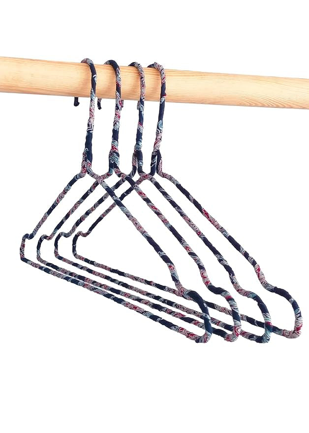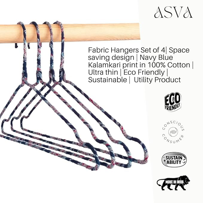 Fabric Hangers Set of 4 | Ultra Thin Design for Shirts, Dresses, Kurtas & Scarves | Space-Saving Storage| Navy Blue Kalamkari print in 100% Cotton| Sustainable | Utility Product