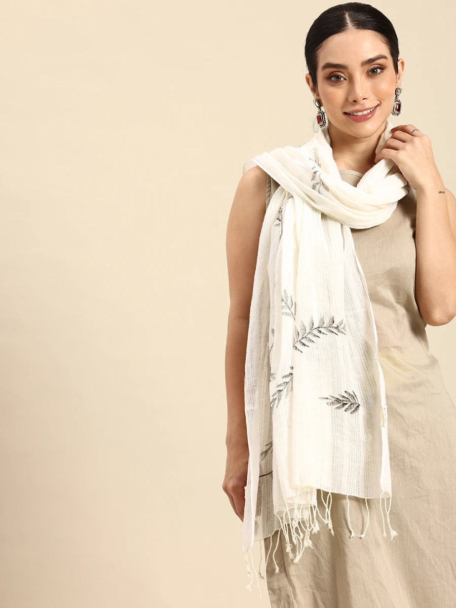 Handwoven Off-White Cotton With Jamdani Work All Over In Blue & Blue Selvedge