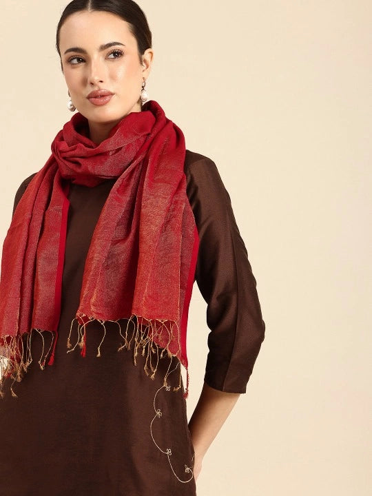 Handwoven Red Cotton Tissue Scarf with Gold Zari Weave and Red Selvedge, Elegant Lightweight Accessory for Women