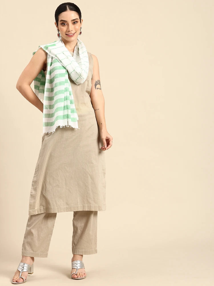 Handwoven White Cotton Scarf with Green thick & thin stripes Allover